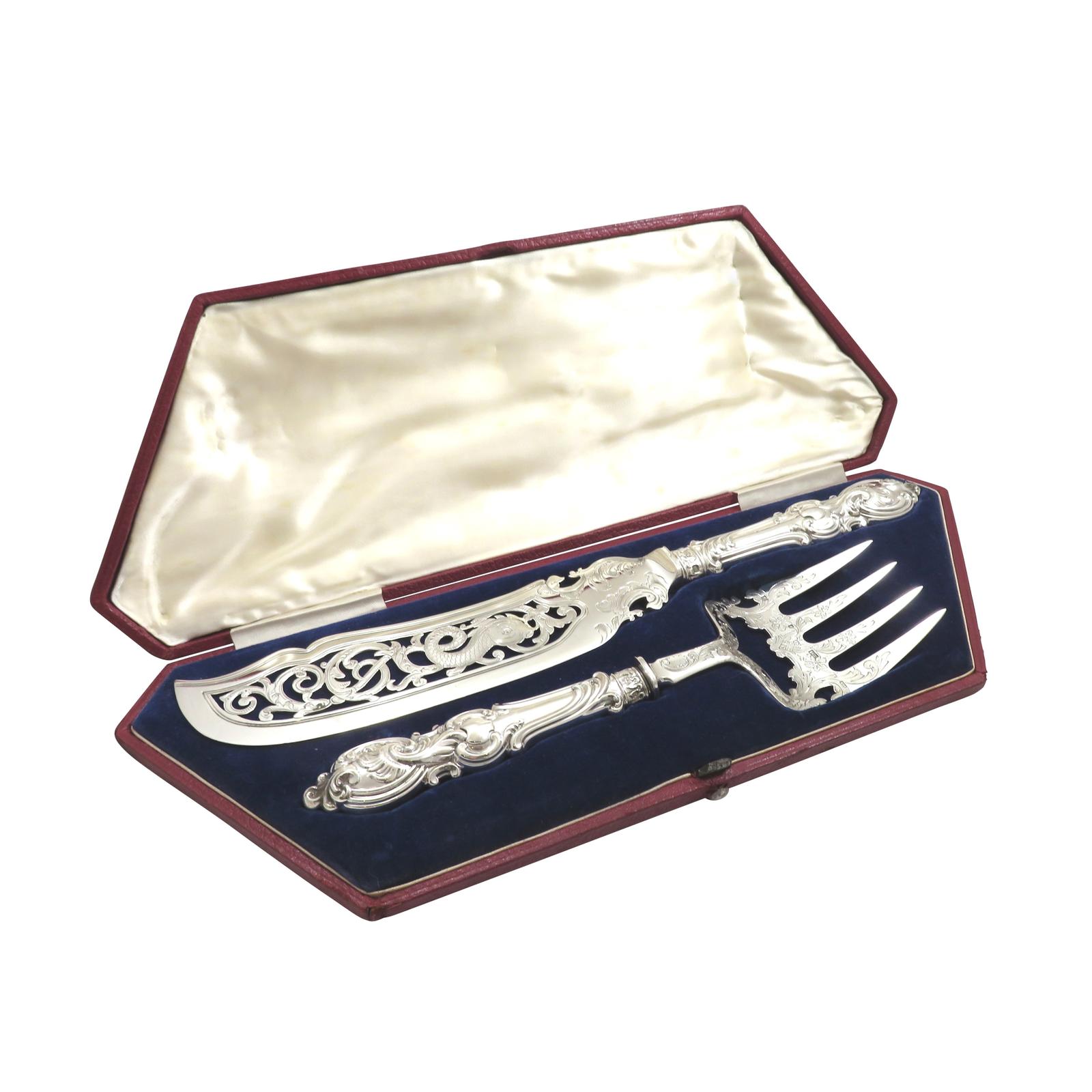 Antique Victorian Sterling Silver Fish Servers in Case 1847