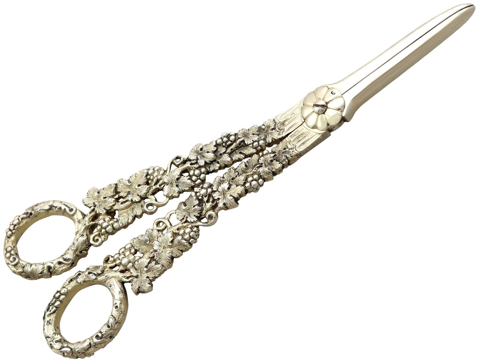 These early Victorian grape shears are a distinctive and highly decorative piece, traditionally used for serving fruit at the table, where their finely cast form and period detailing reflect both practical purpose and the elegance of Victorian dining, making them an appealing addition to a curated antique silver collection or a thoughtful gift for collectors and entertainers alike.
