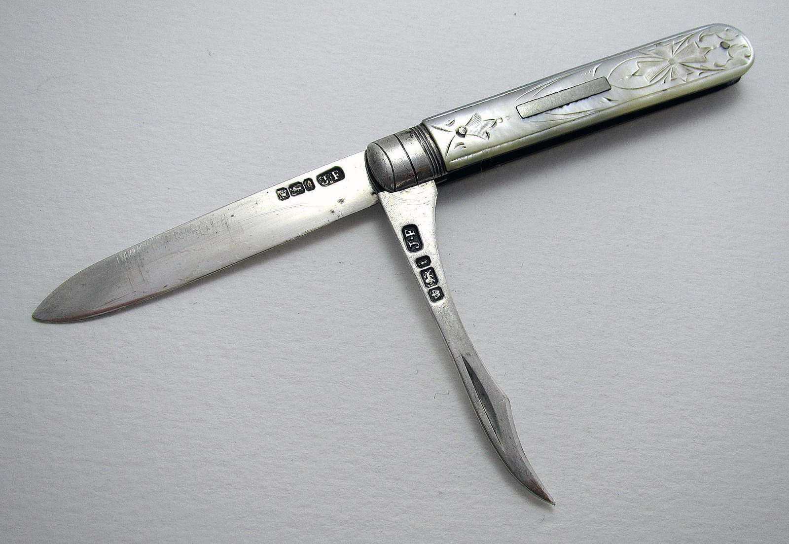 Antique Victorian Sterling Silver & Mother of Pearl Mop Folding Penknife+Seed Pip Pick Remover. Pocket Pen Fruit Knife. English Sheffield