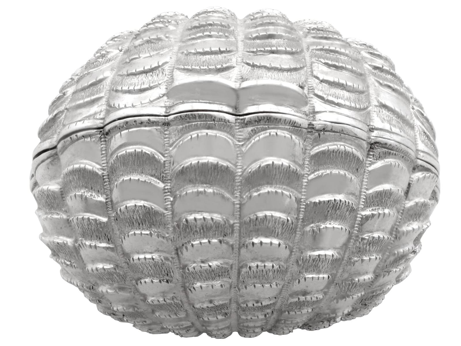 The cover and body of this antique silver nutmeg grater are embellished with details reproducing the shell's natural exterior.
