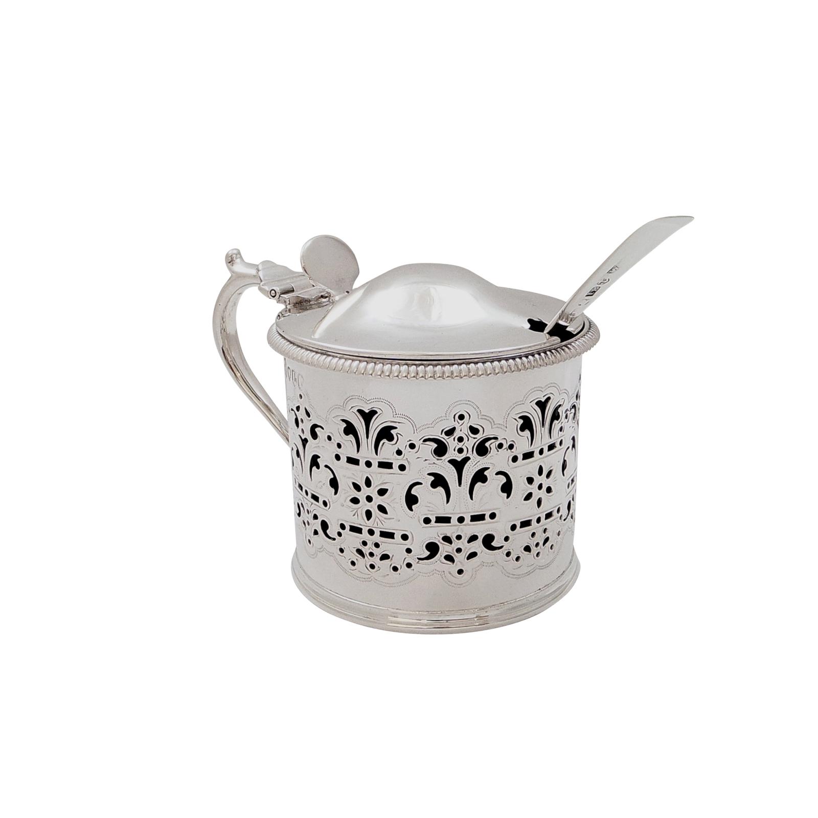 Antique Victorian Sterling Silver Pierced Mustard with Spoon 1886