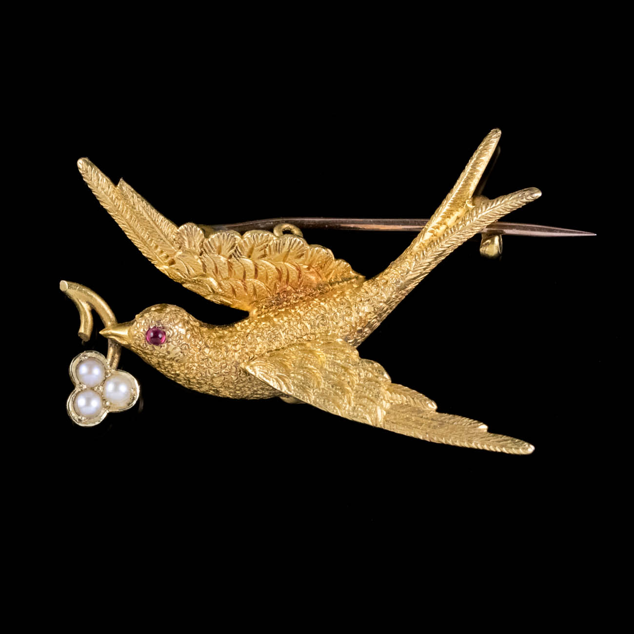 Antique Victorian Swallow Brooch Pearl Clover 15ct Gold c.1880 Boxed