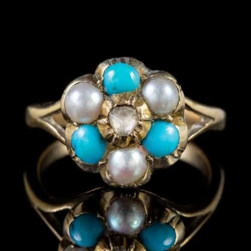 Antique Victorian Turquoise Pearl Cluster Ring 9ct Gold Georgian Face c.1880