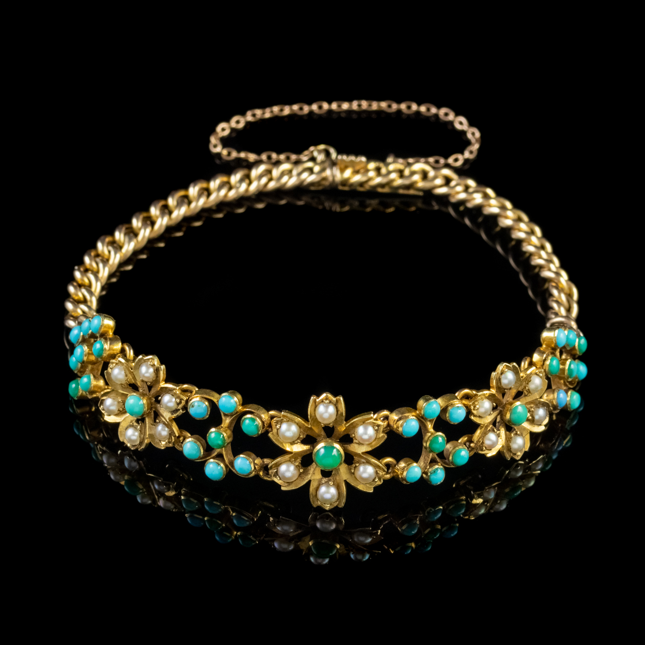 Antique Victorian Turquoise Pearl Forget Me Not Bracelet 15ct Gold c.1880