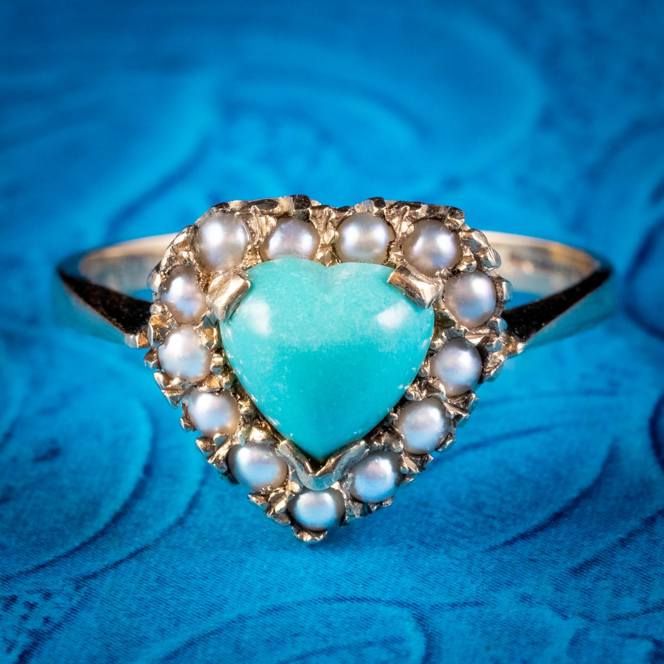 Antique Victorian Turquoise Pearl Heart Ring 9ct Gold c.1900