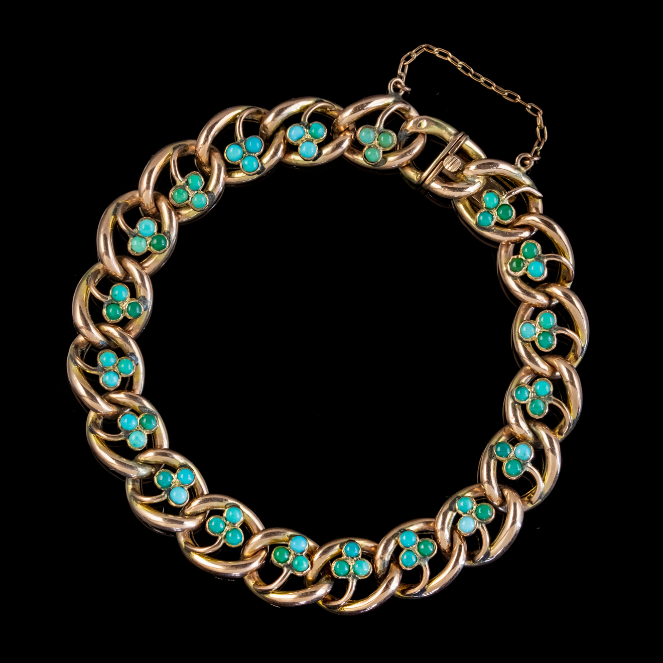 Antique Victorian Turquoise Shamrock Curb Bracelet 9ct Gold c.1900