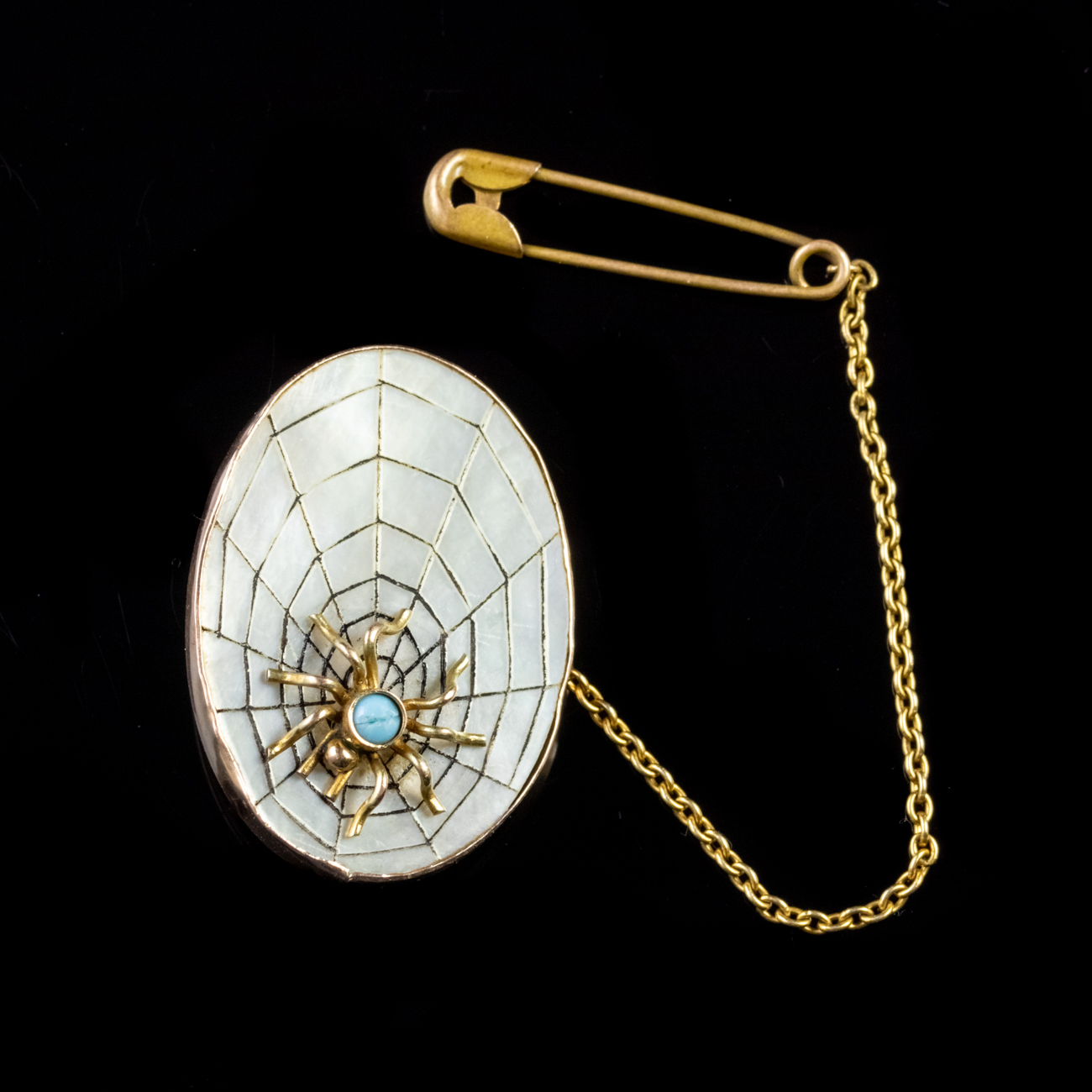 Antique Victorian Turquoise Spider Web 9ct Gold Mother of Pearl Brooch c.1880