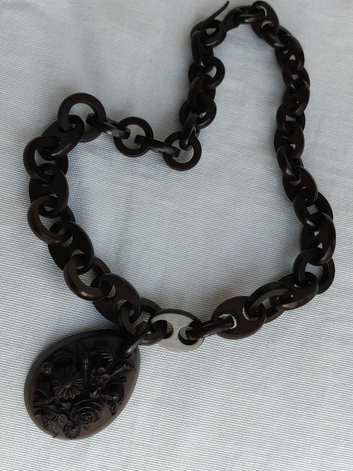 Antique Victorian Vulcanite Huge Chain Mourning Necklace Cameo Pendant & Hook Clasp