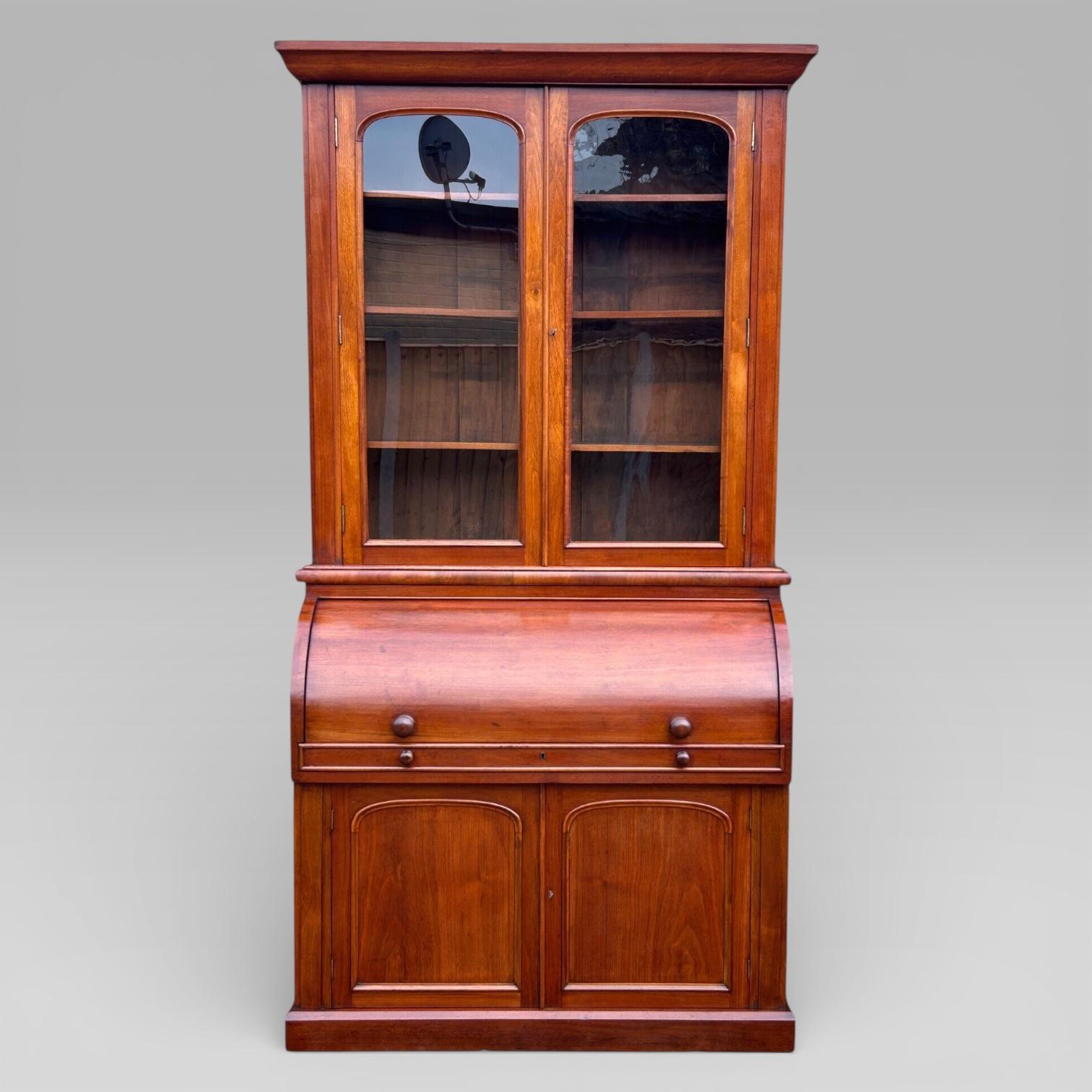 Antique Victorian Walnut Cylinder Bureau Bookcase with Writing Desk & Cupboard