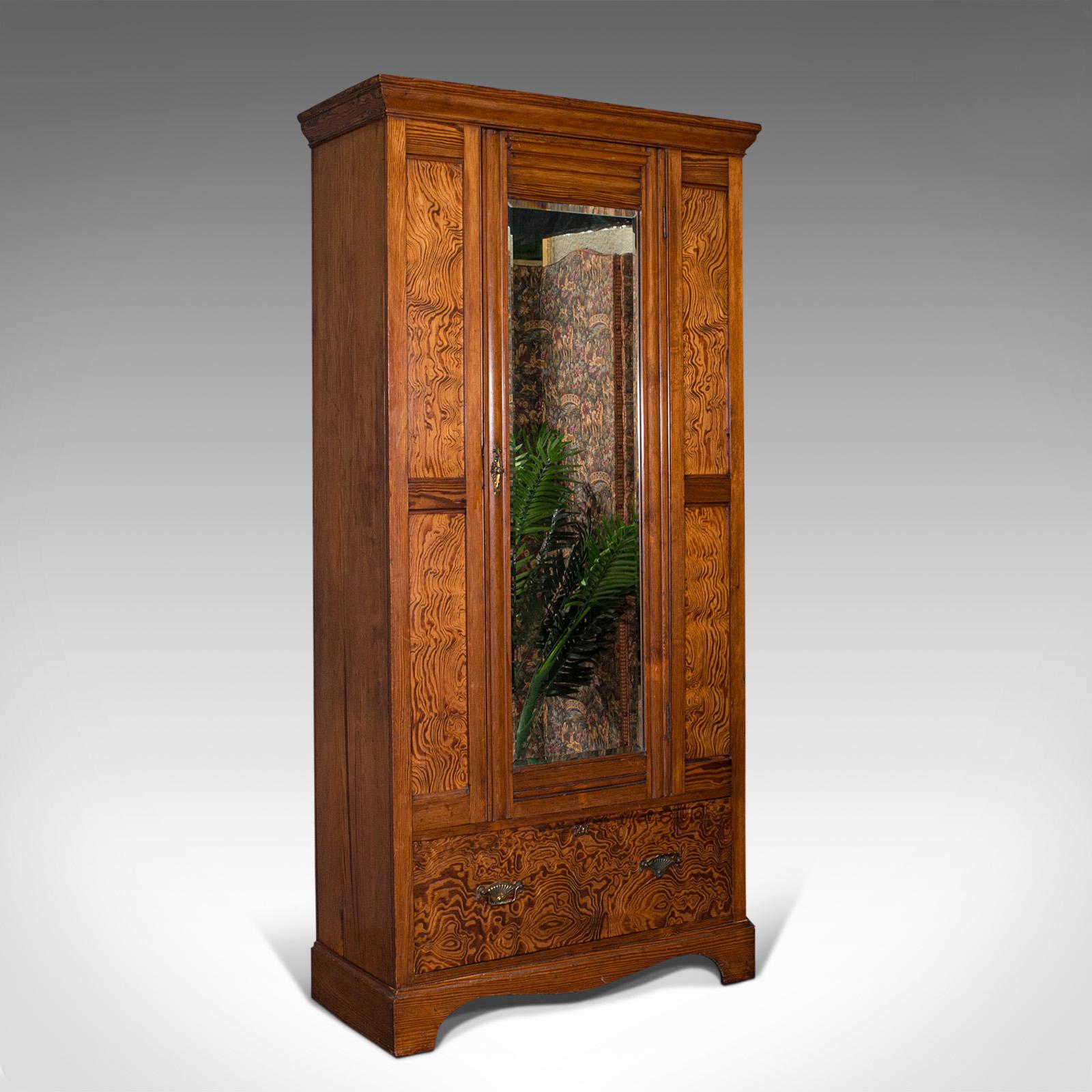 Antique Wardrobe, English, Pitch Pine, Closet, Dressing Mirror, Victorian c.1900