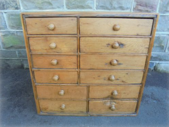 Antique Waxed Pine Bank of 12 Chemists Drawers c.1880