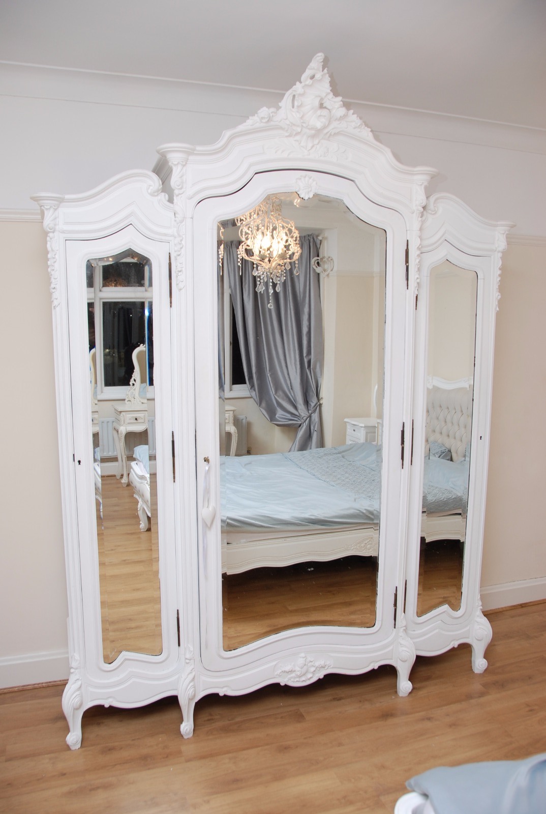 Antique White French 3 Door Mirror Wardrobe / Armoire
