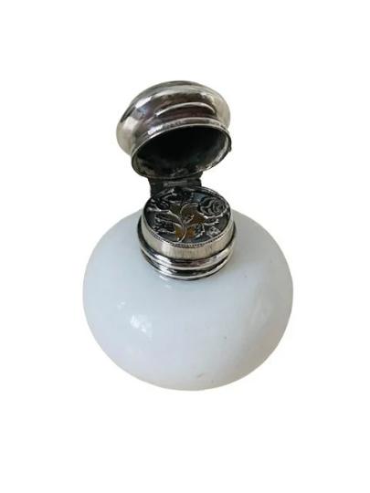 Antique White Opaline / Milk Glass Perfume Scent Vinaigrette Bottle Silver Lid Circa 1880