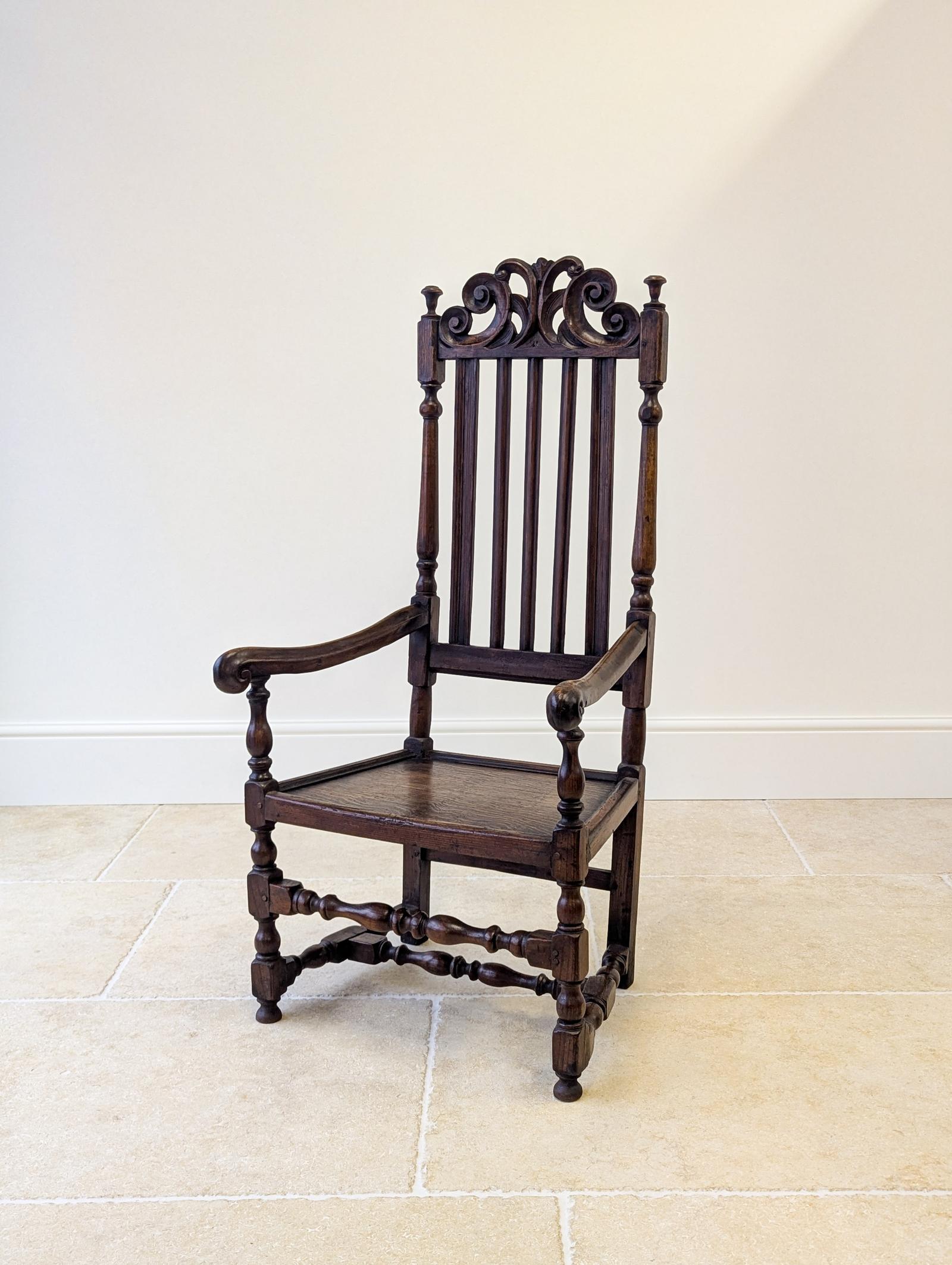 A William and Mary period oak armchair of tall, high-backed proportions, dating to around 1700. The slatted back is surmounted by a pierced scroll crest, above swept open arms and a panelled seat within a framed surround, all raised on turned legs united by a robust stretcher base.
