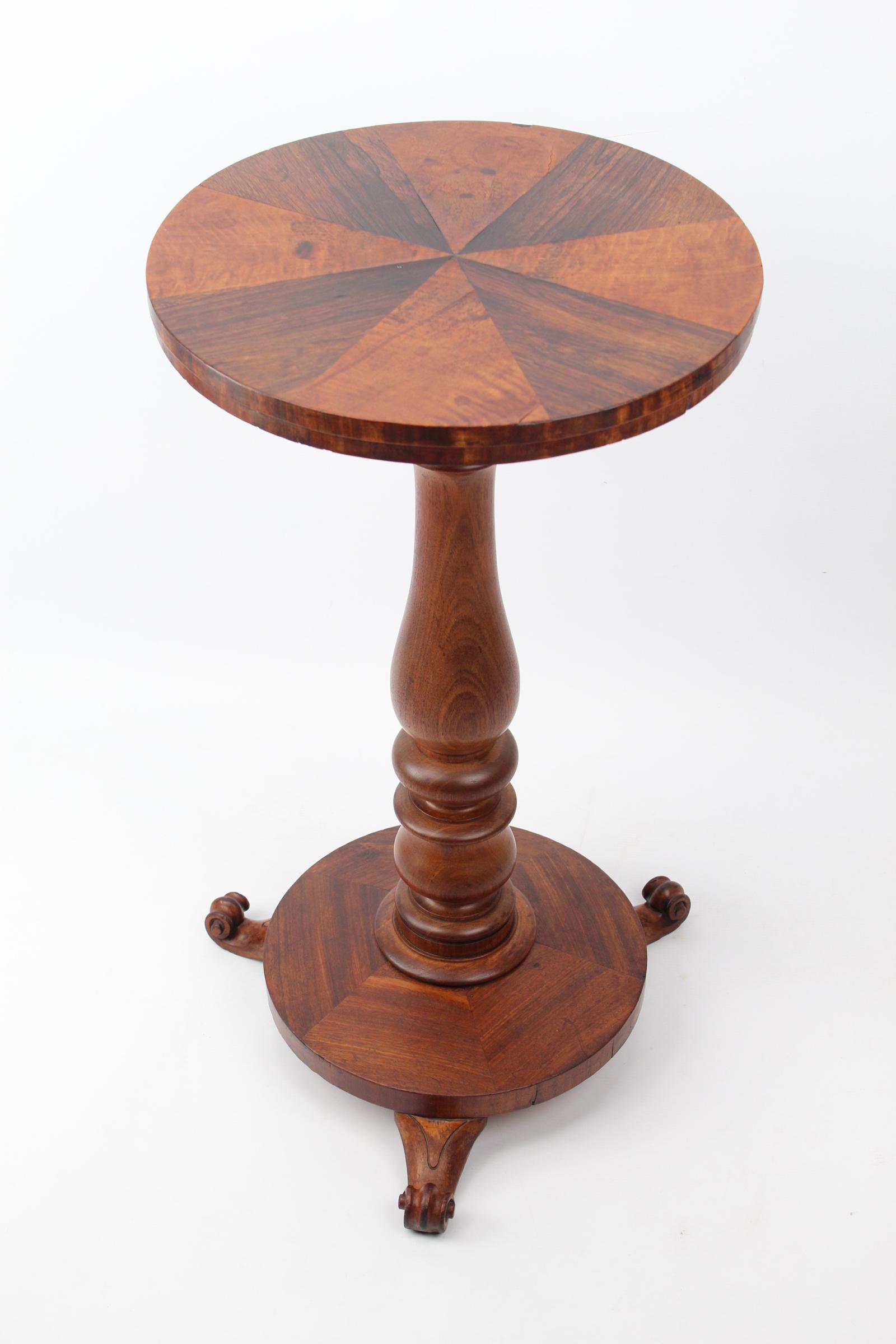 A charming small antique William IV mahogany wine table or lamp table dating from circa 1835. Featuring a well-figured circular specimen wood top in a geometric design over a turned column raised on a circular base on small scroll feet. With good colour and patina, this wonderful elegant table would make a great lamp table in a living room or hall. The specimen woods to the top are lifting slightly (see photos).
