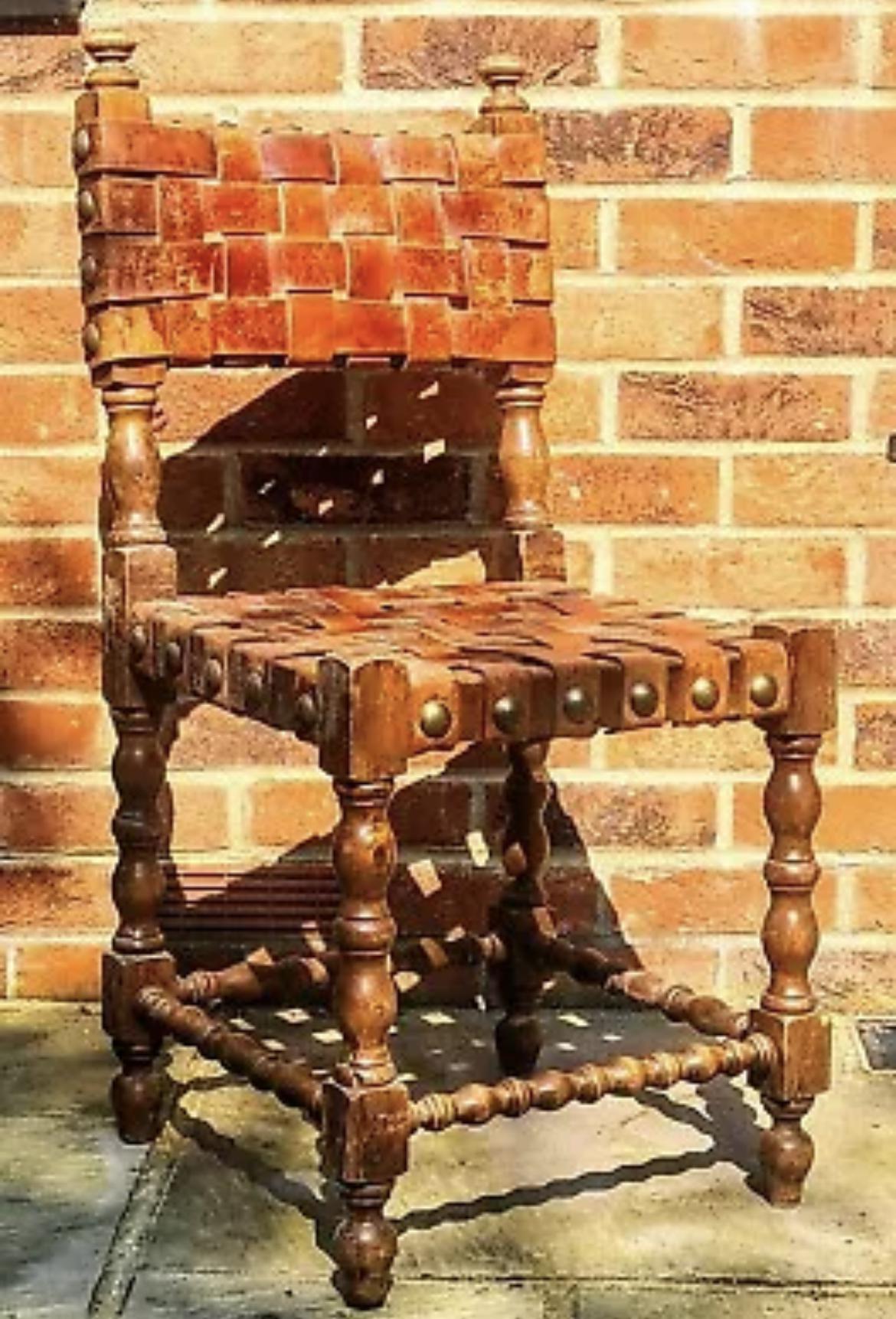 Antique Wood Riveted Woven Leather Seat Chair 19th Century