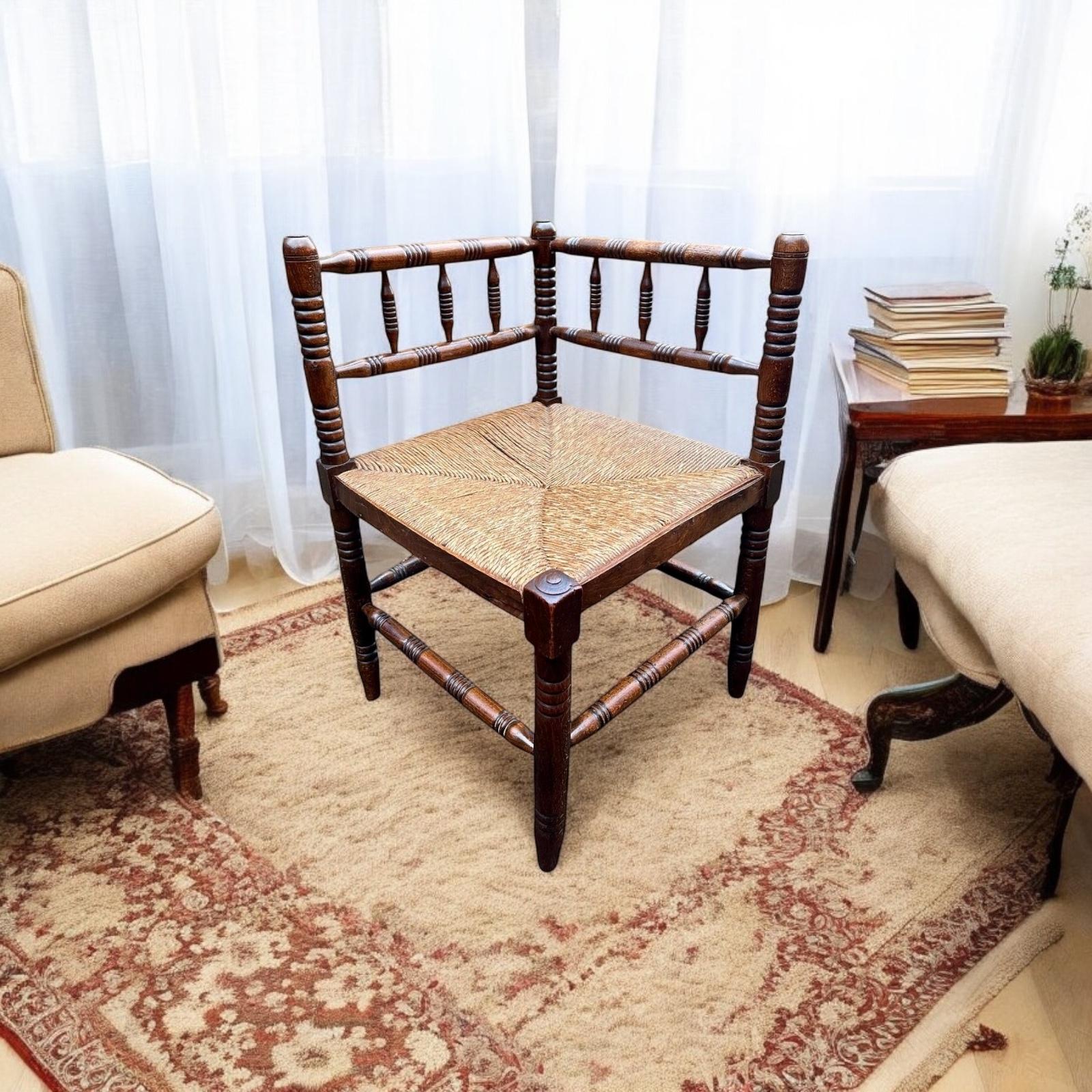 Antique Wooden Corner Chair / Rush Seat / C1910