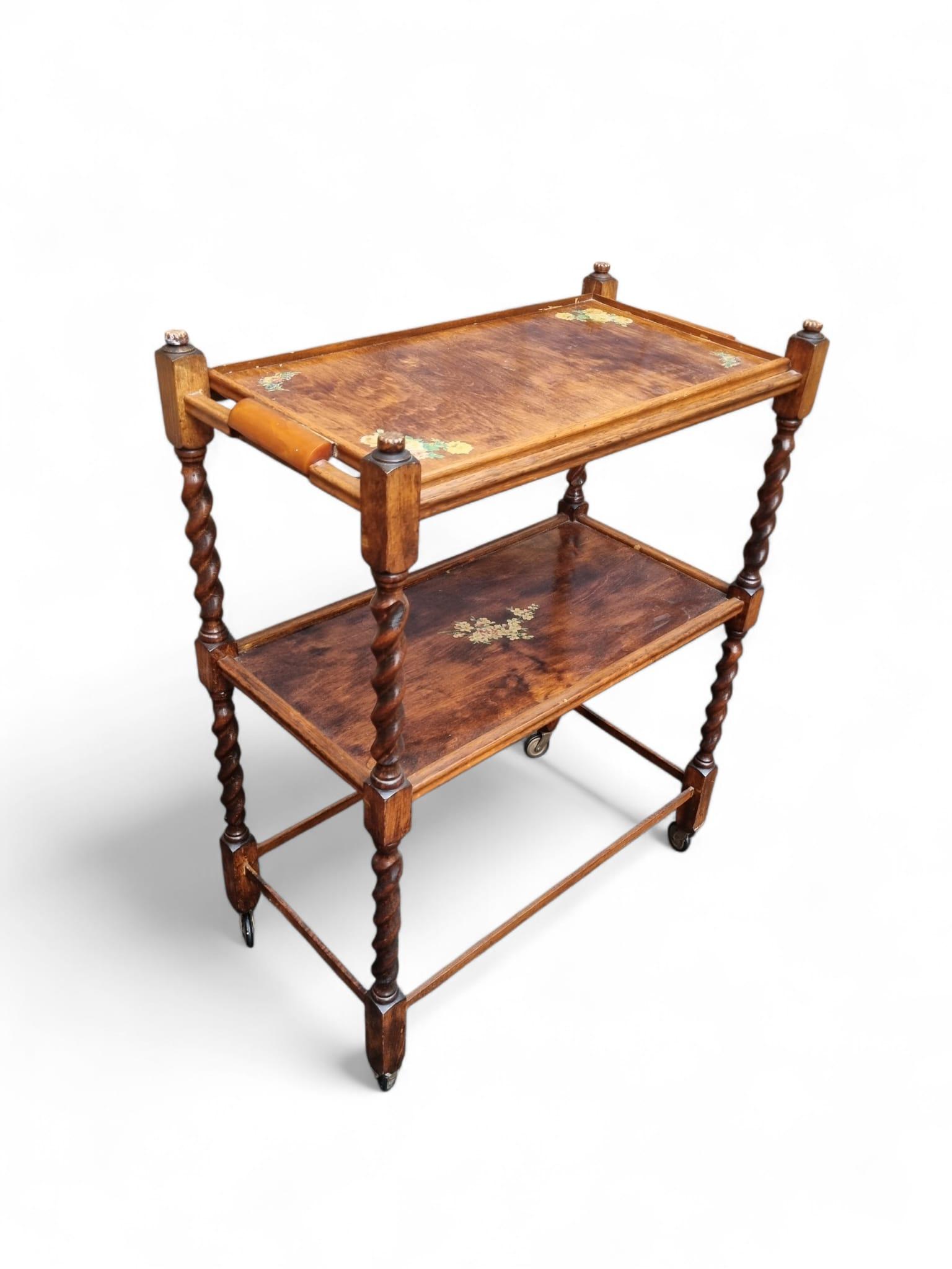 A charming antique wooden tea trolley dating from the early 20th century, featuring elegant barley-twist legs, a removable serving tray, and original castors.