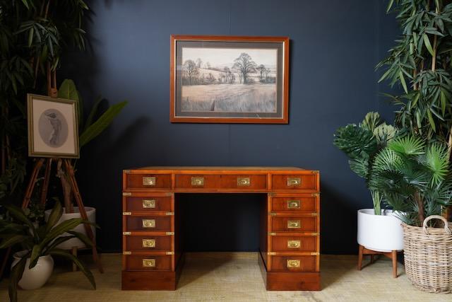Antique Yew Wood Military Campaign Style Pedestal Desk 1930s