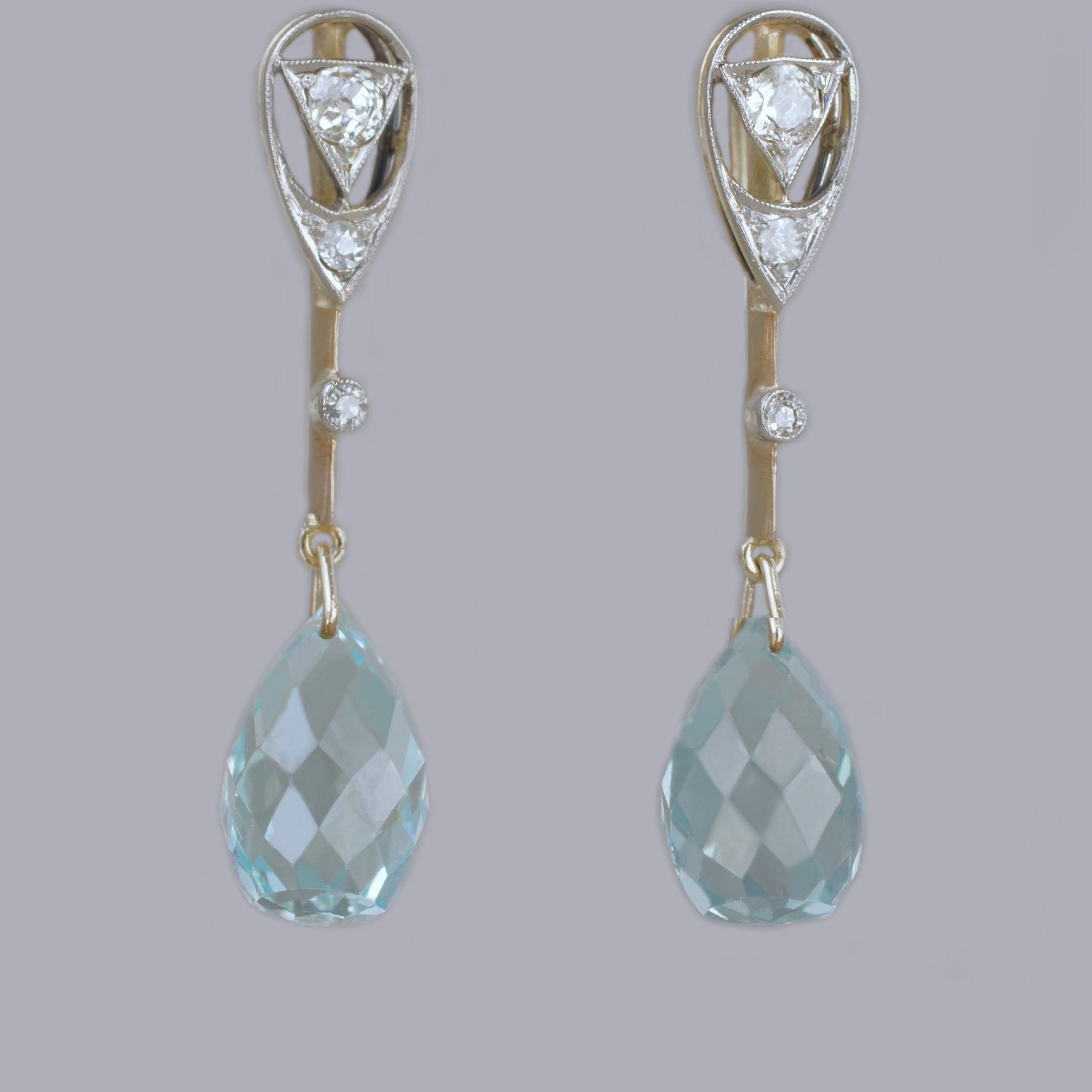Aquamarine & Old Cut Diamond Edwardian Drop Earrings Antique 18ct Gold Dangle Earrings