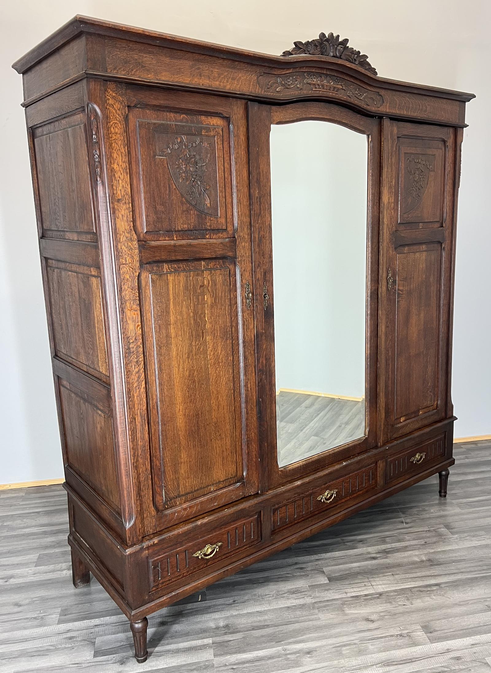 Armoire Wardrobe Antique French Carved Mirrored Oak Closet Cabinet (LOT 3841)