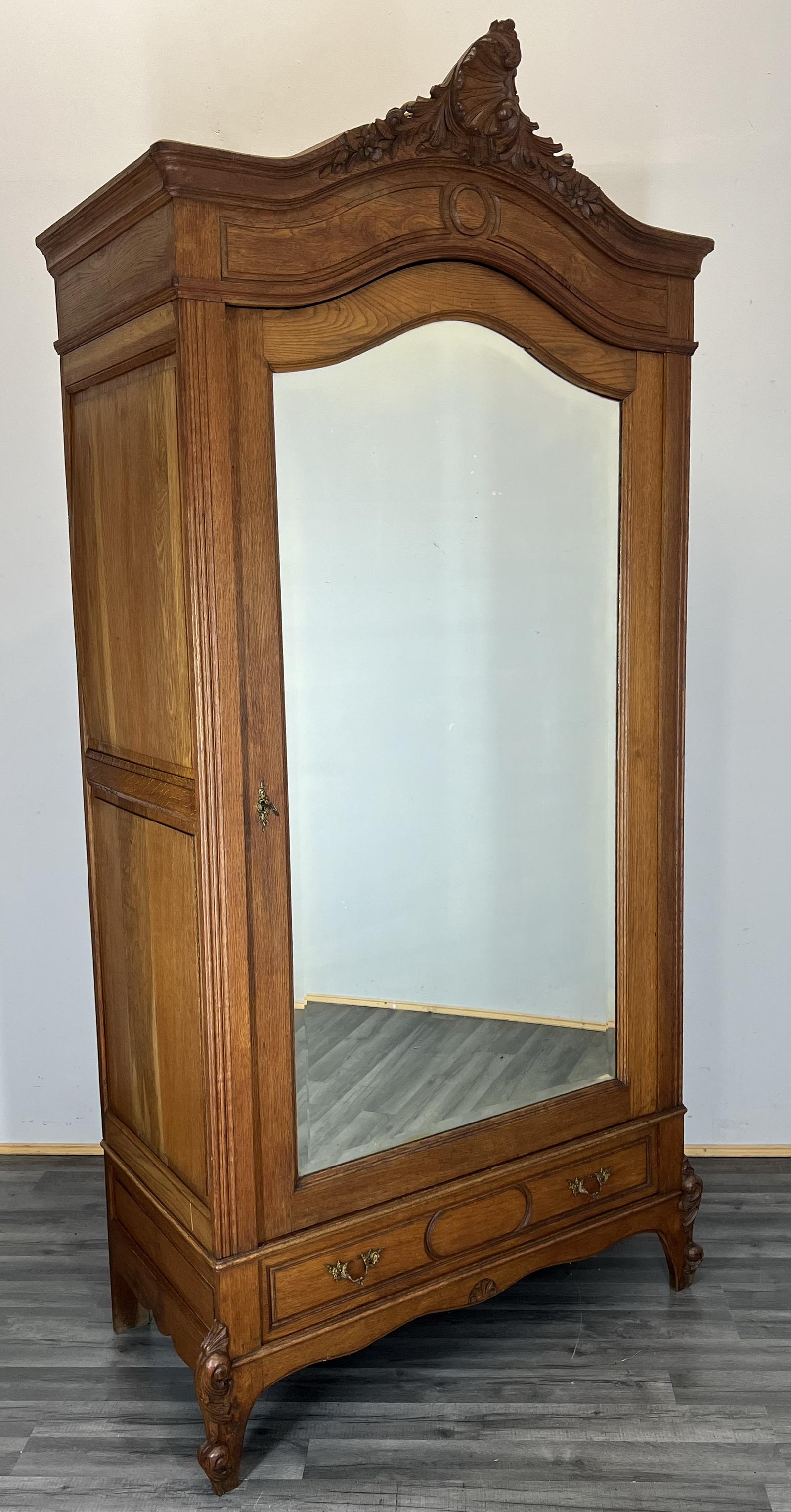 Armoire Wardrobe - Antique French Carved Oak Mirrored Rocaille Wardrobe