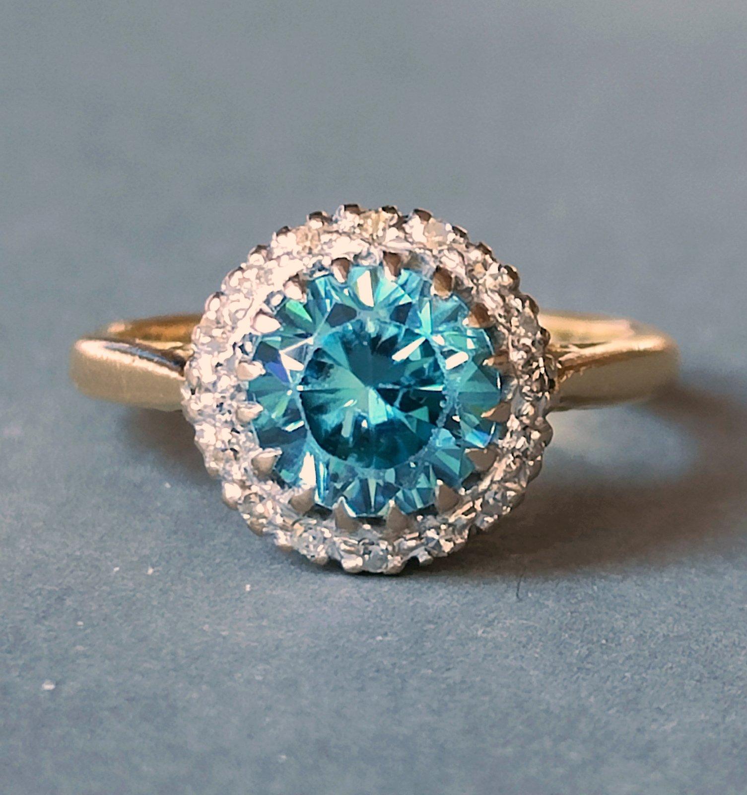 Art Deco 18ct Gold Diamond Natural Blue Zircon Ring c.1923