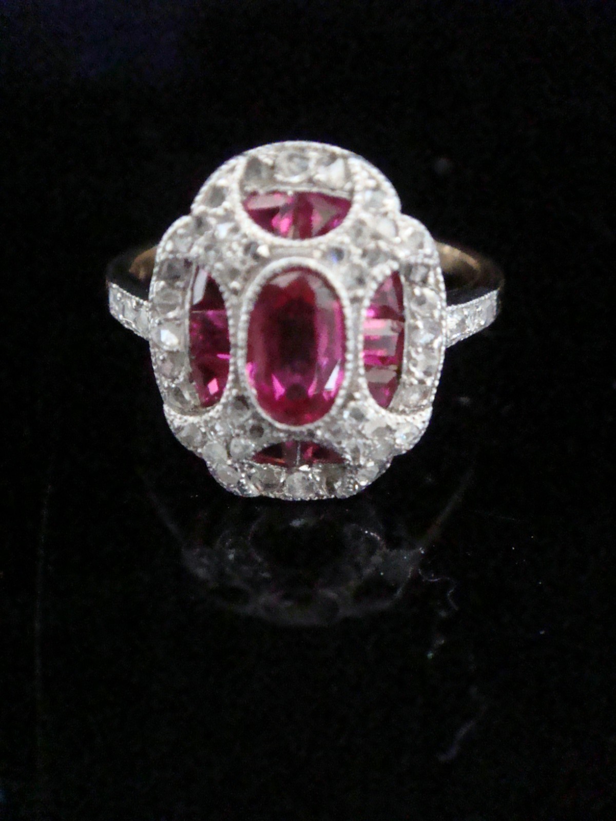 Art Deco 18ct Platinum French Calibre Cut Ruby & Old Cut Diamond Cluster