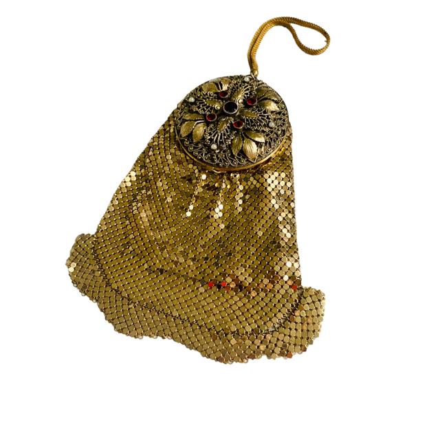 Art Deco 1920's Evans Gold Mesh & Jewelled Filigree Flapper Vanity Purse Powder & Rouge Compact