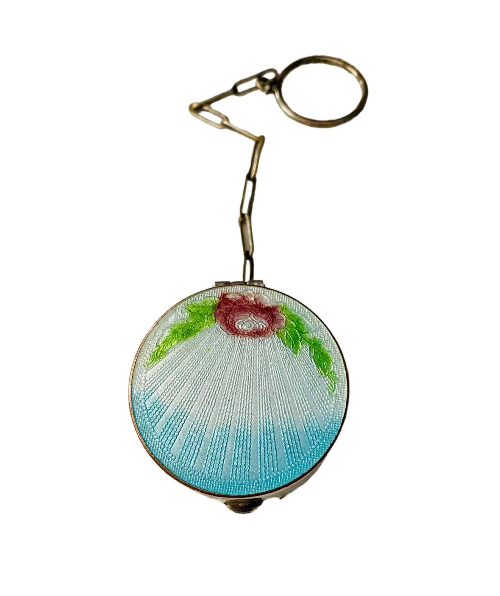 Art Deco 1920s Guilloche Enamel Pendant Powder Compact with Finger Ring & Chain