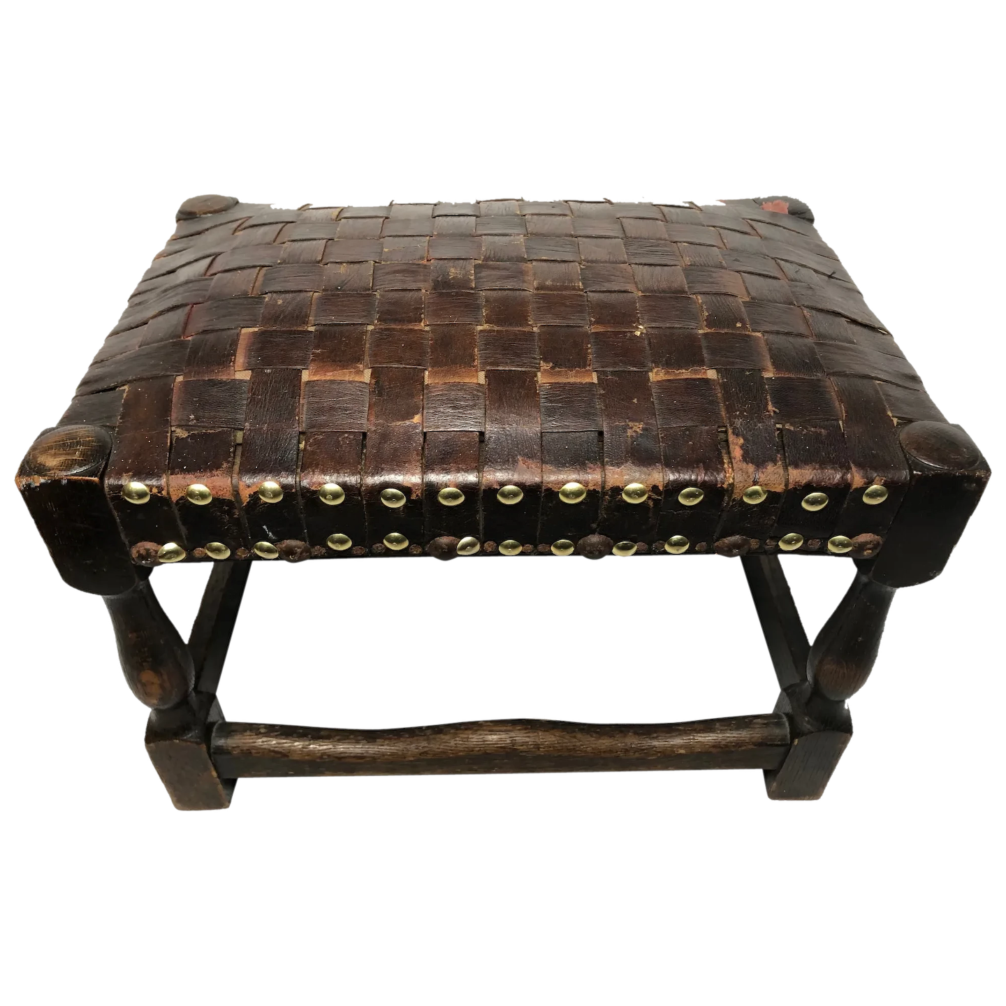 Art Deco 1930s English Handmade Oak & Leather Strapped Brass Studded Footstool