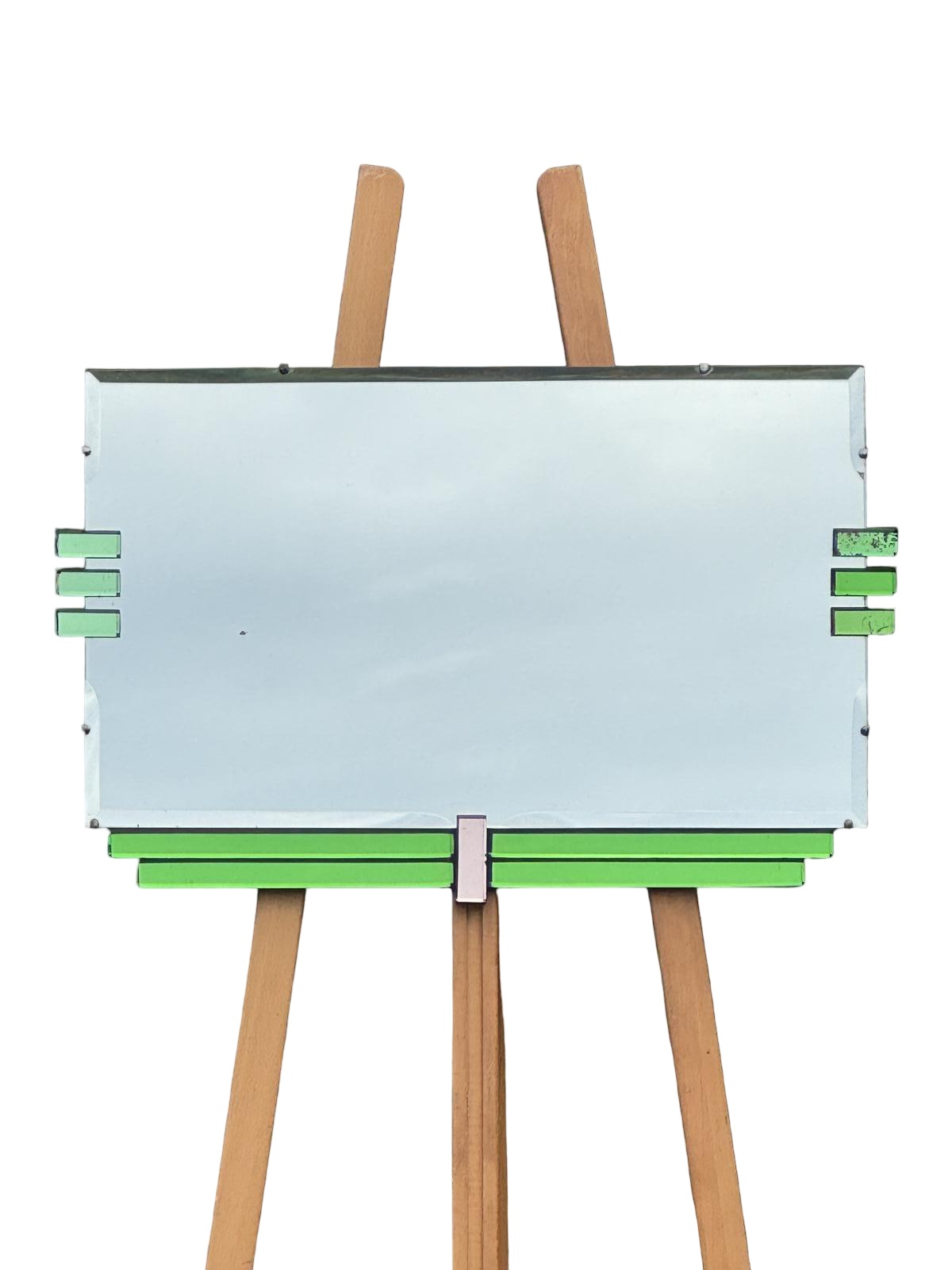 The mirror consists of 10 individual pieces, a large rectangular centre plate with a deep bevelled edge which catches the light beautifully. There are six side pieces of green mirror, three each side of the centre plate, each of these have a bevelled edge all round.