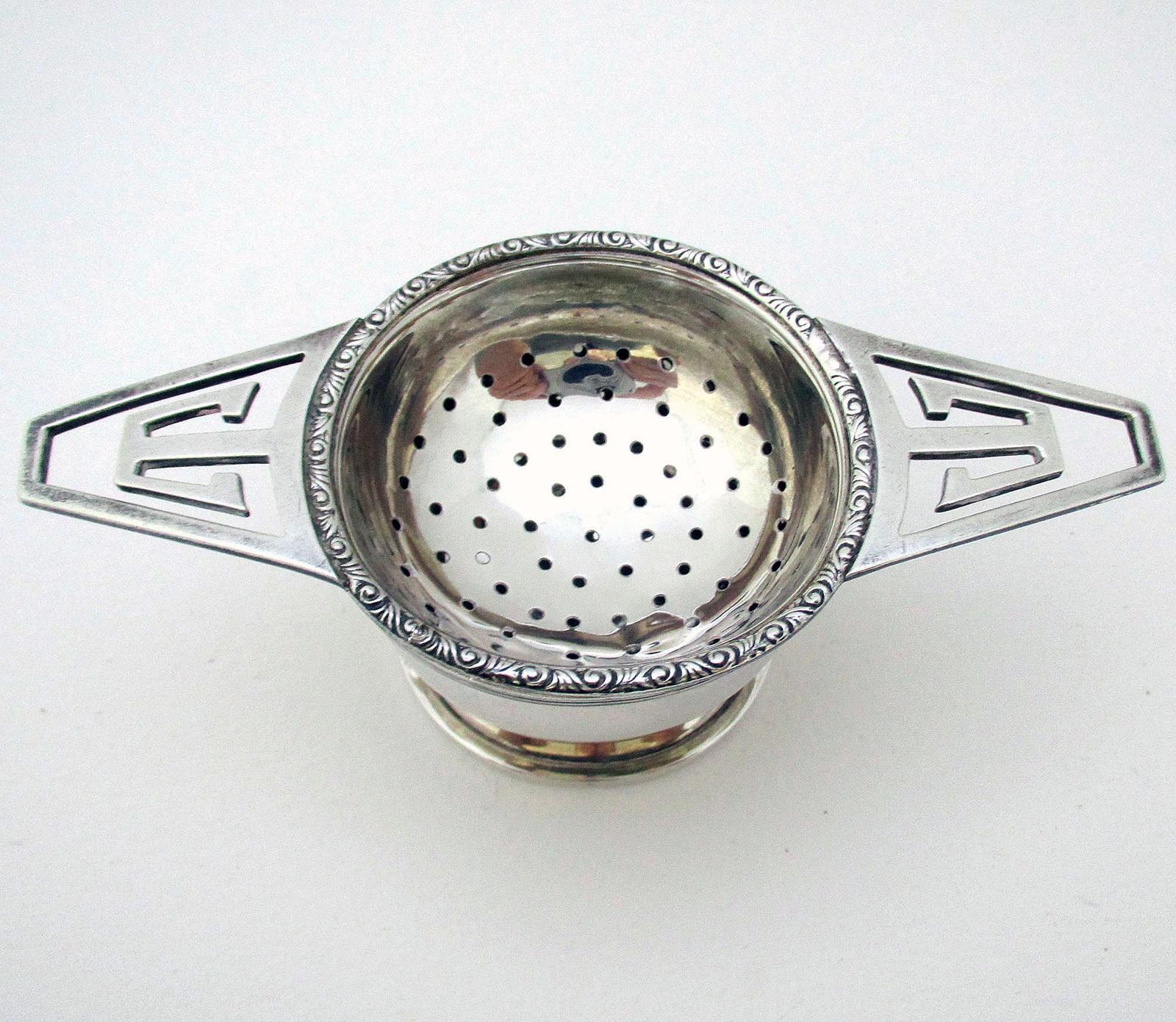 Art Deco 1935 Solid Sterling Silver Double-handled Tea Strainer with Drip Bowl Tray, Walker & Hall