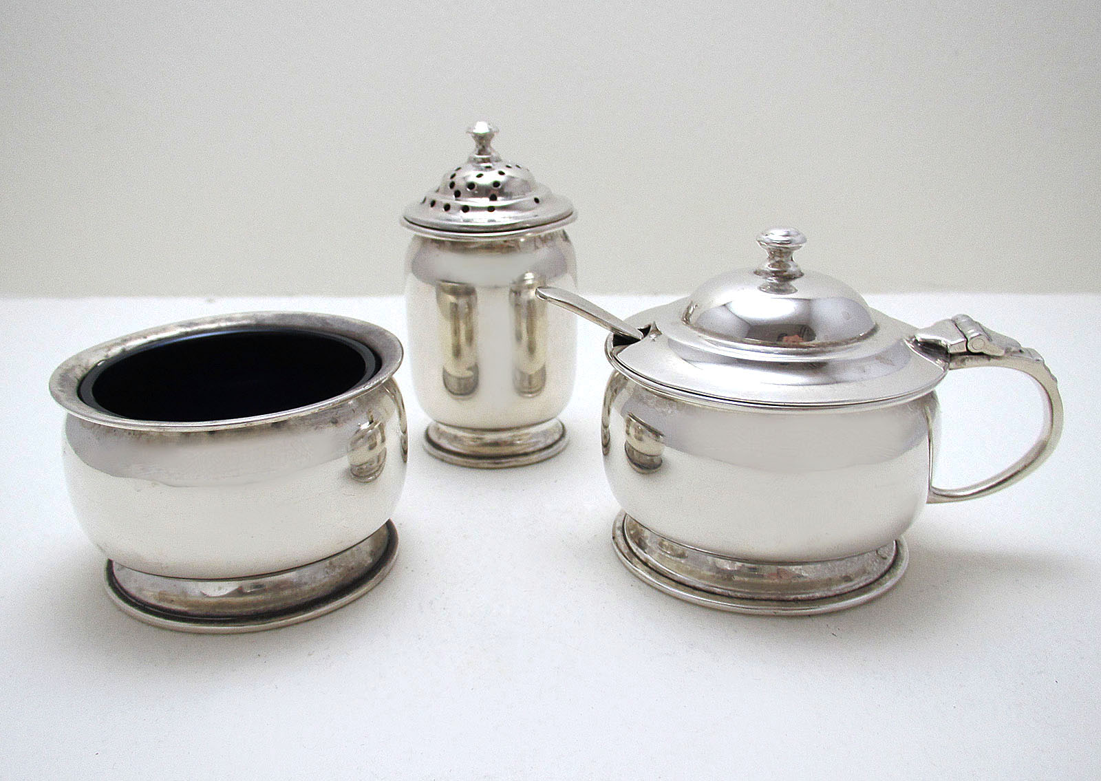 Art Deco 3-Piece Solid Sterling Silver Cruet Set 'Salt Cellar, Mustard Pot & Spoon, Pepper / Pepperette / Shaker' English Hallmarked