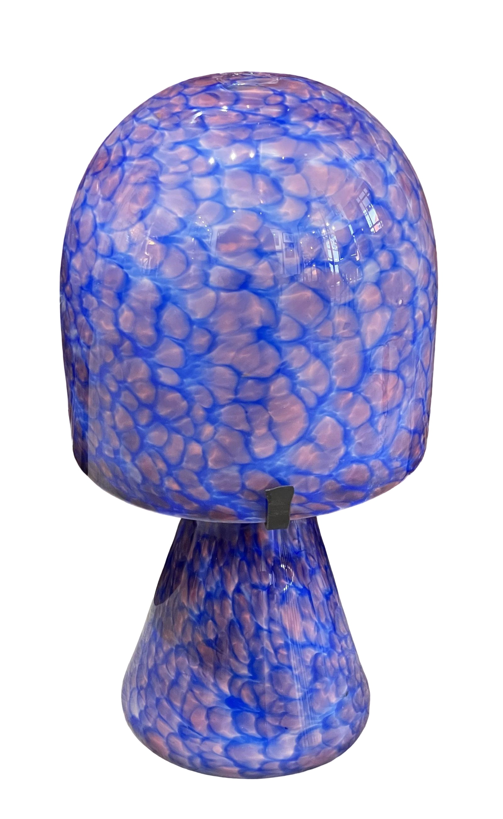 A very stylish French studio glass table lamp by Jean Claude Novaro of baluster form with corresponding mushroom shade, decorated with blues and pinks. Fully rewired in period style braided flex and PAT safety tested