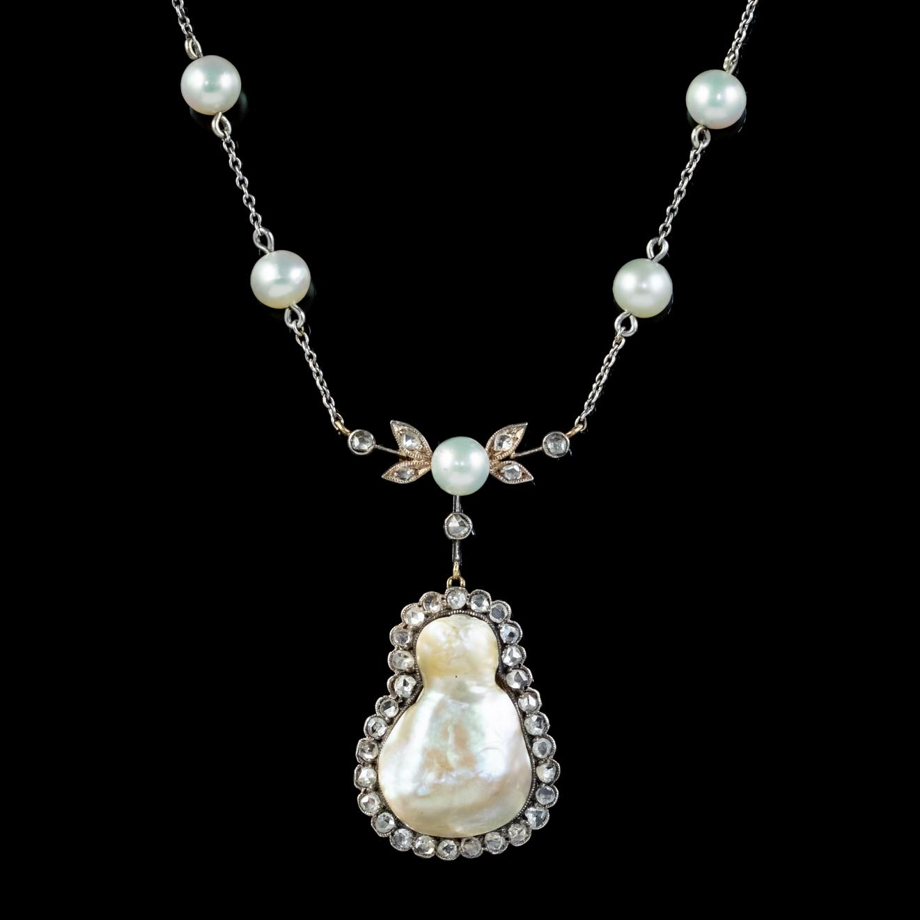 Art Deco Baroque Pearl Diamond Lavaliere Necklace 18ct Gold 2ct of Diamond c.1920