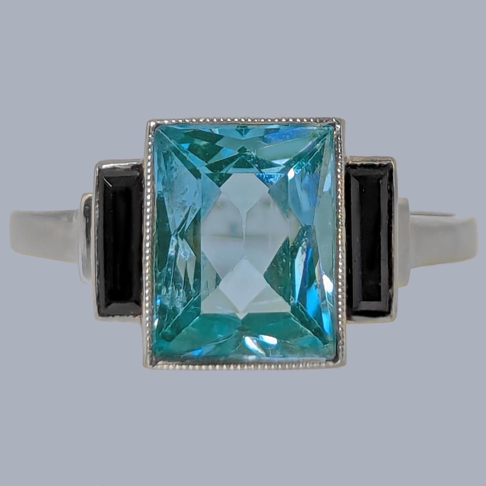 At its centre sits a vivid aqua-blue synthetic spinel, cut in a bold rectangular form with crisp facets that catch the light beautifully. To either side, sleek black onyx panels provide a striking contrast, enhancing the clean, architectural lines that define the Art Deco aesthetic.