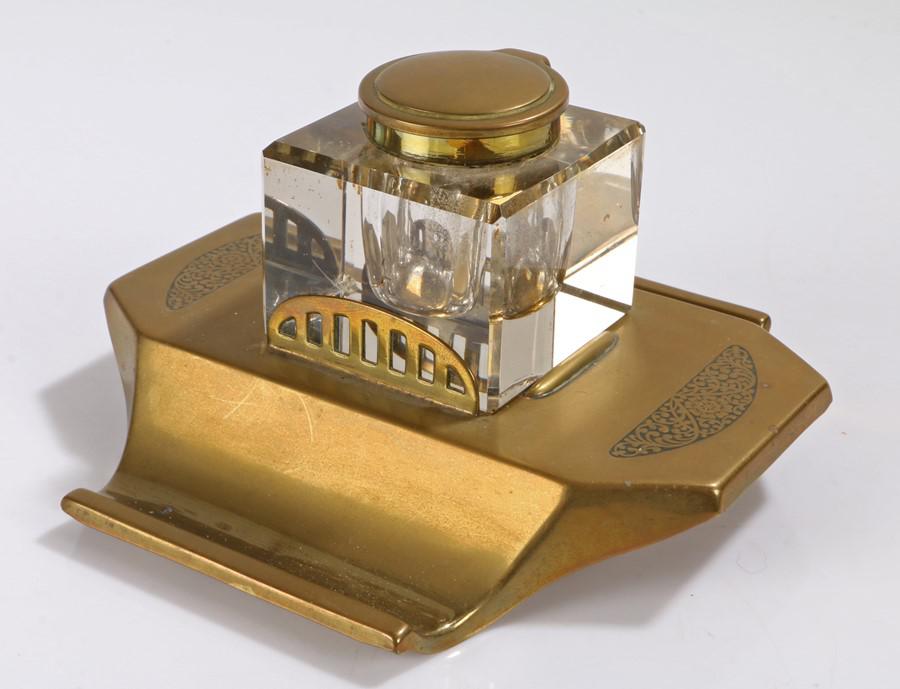 Art Deco brass and glass inkwell, the hinged brass lid above a clear glass body and brass base with two pen trays and engraved foliate scroll decoration,