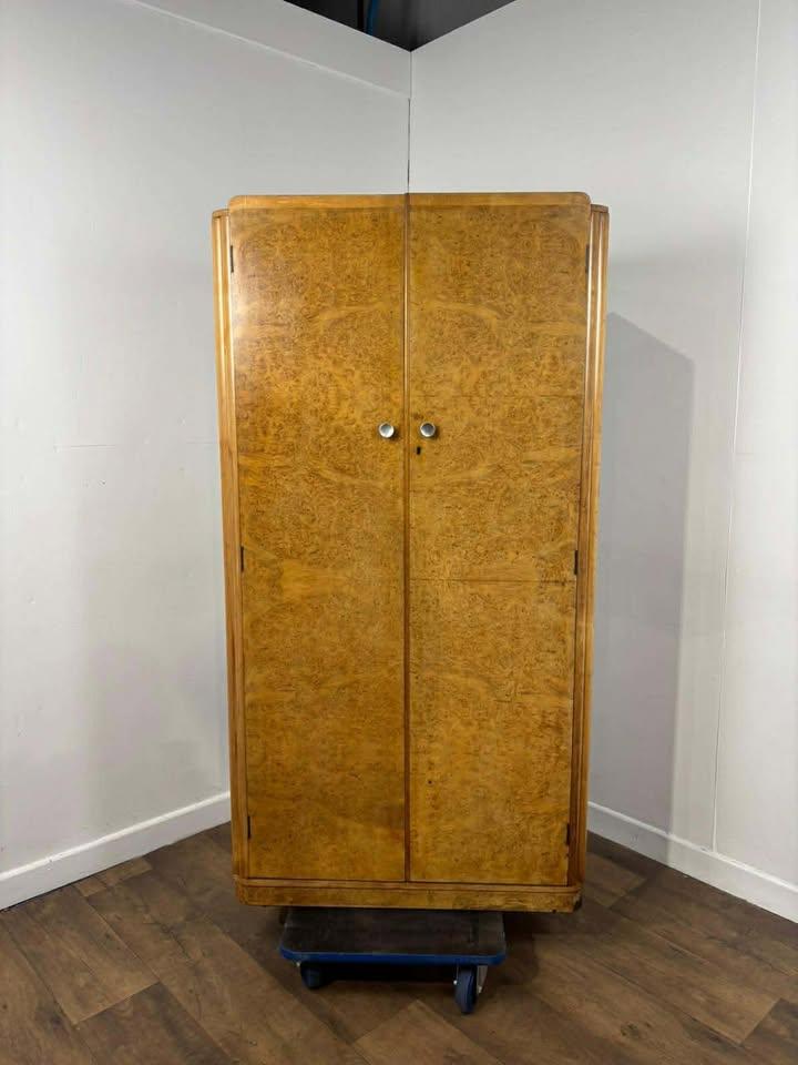 A handsome Art Deco burr walnut veneered fitted gentleman’s wardrobe, full of character and classic period charm. Featuring stylish metal door knobs and a warm figured grain, this piece offers both visual appeal and practical storage.