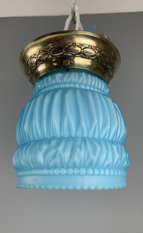 Art Deco Ceiling Light With Original Blue Shade; Brass Gallery; Rewired