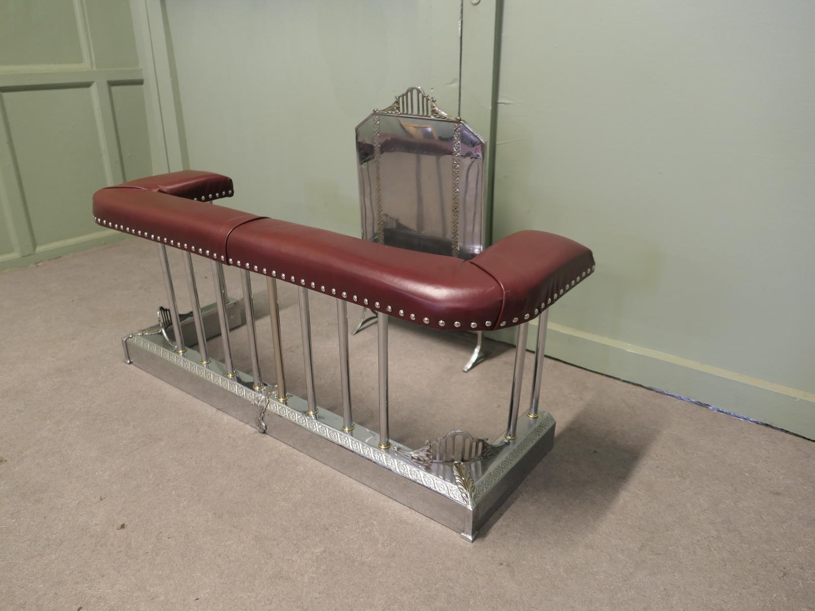 This is an elegant and very fashionable piece of its own time, the chrome fender is upholstered in burgundy leather with uprights in chrome. The fender is in good condition and the seat is just the right height to attend to the fire comfortably and as a nice extra there is a matching Art Deco chrome fire screen.