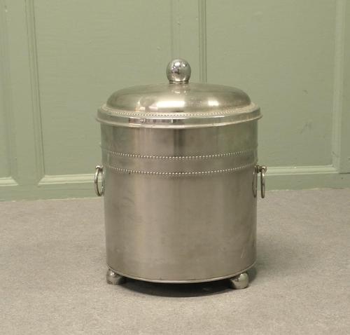 Art Deco Chrome Coal Bucket A classic design and a quality piece, the coal bucket stands on ball feet and has a ring handle on each side, a tidy lid and a removable liner The bucket is in good condition. It is 15” high and 13” in diameter Ref: AH187