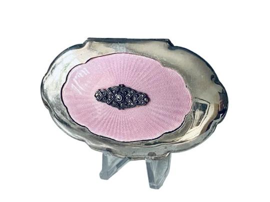 Art Deco Chrome Metal Guilloche Enamel & Marcasite Powder Compact c.1930