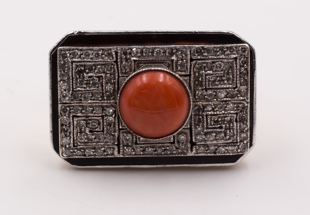 Art Deco Diamond, Onyx, Gold, Silver and Coral Ring