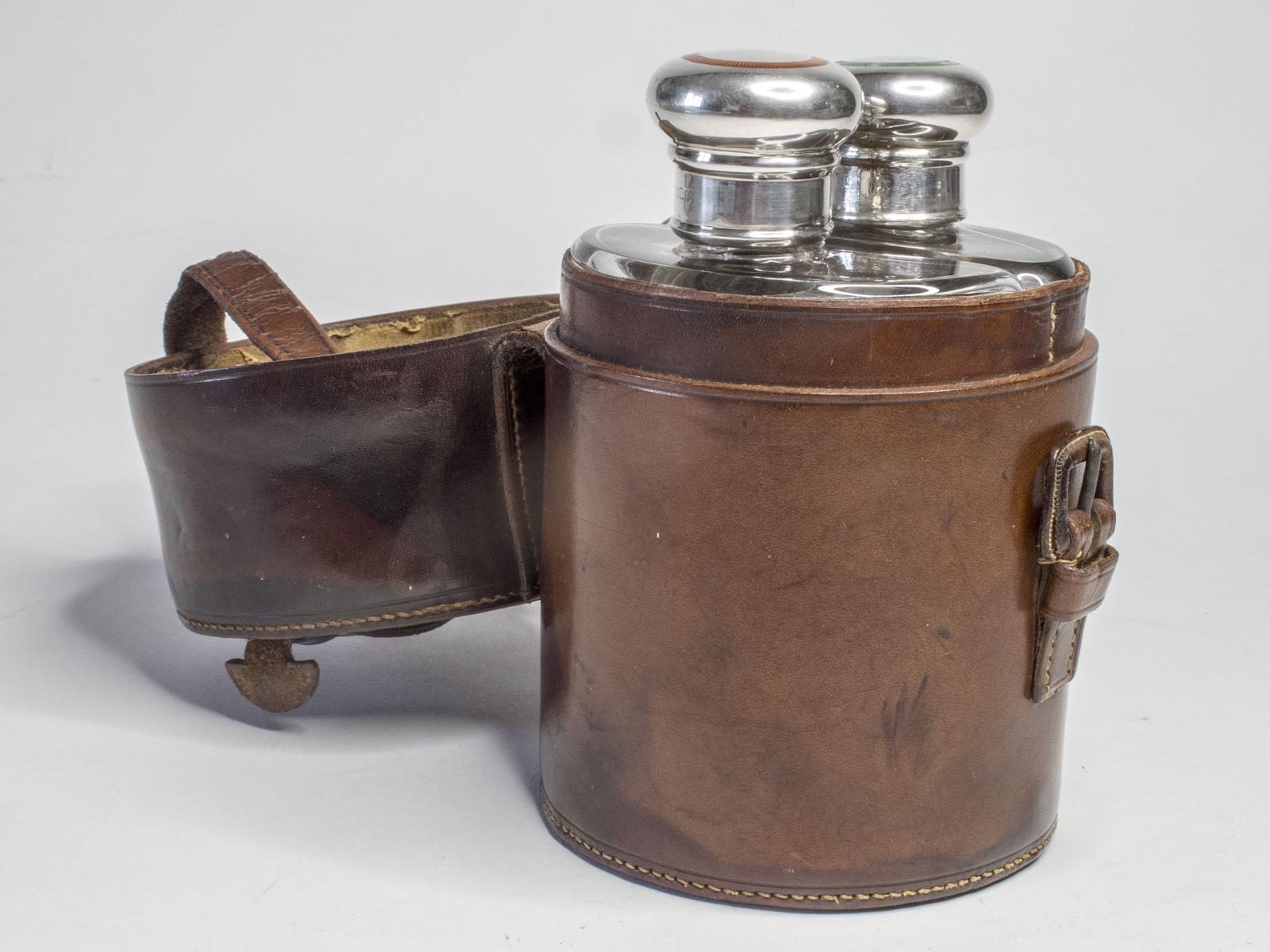Art Deco Double Flasks in Leather Case with Silver Caps