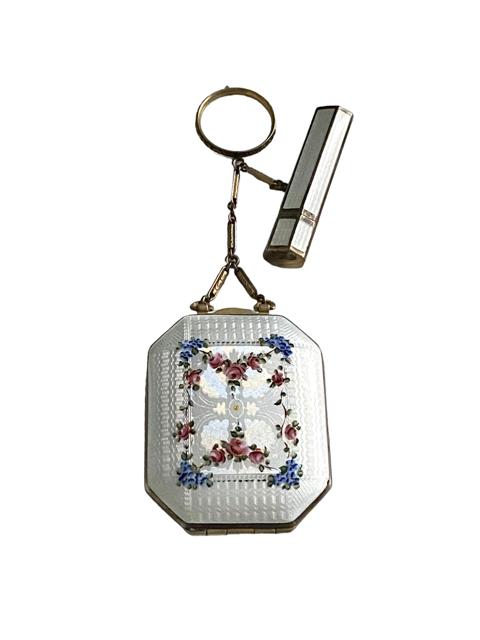 Art Deco Double Sided Guilloche Enamel Tango Chain Powder & Rouge Compact / Vanity Case with Lipstick