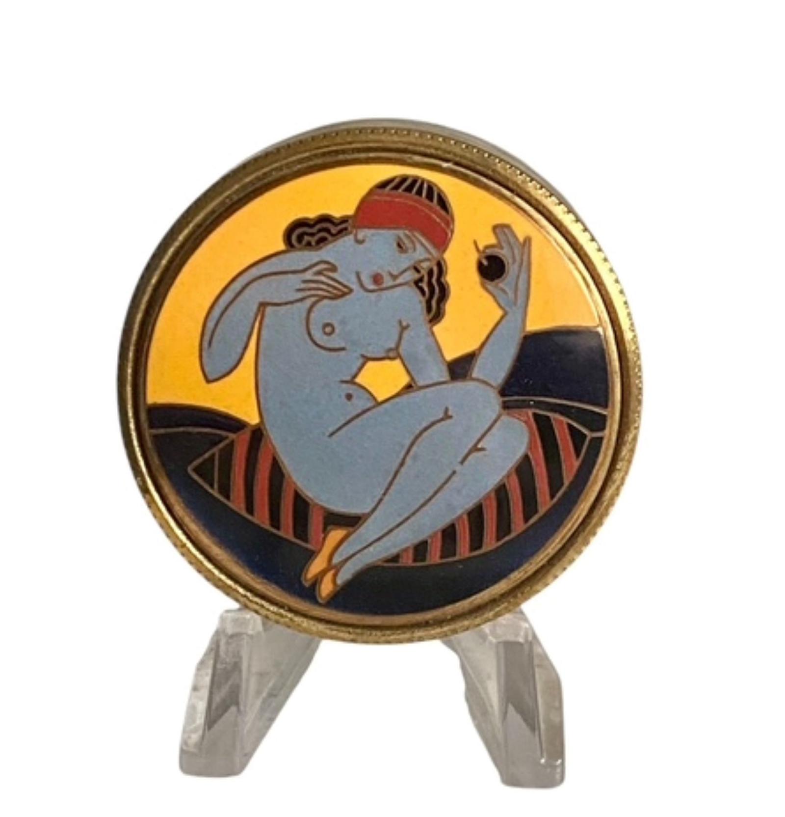 On offer is this rare Art Deco possibly French lidded powder compact / rouge pot dating circa 1920 and measuring 5 cm in diameter. This rouge pot is made of brass metal and the lid has fabulous enamelled design featuring a Greek style reclining nude.