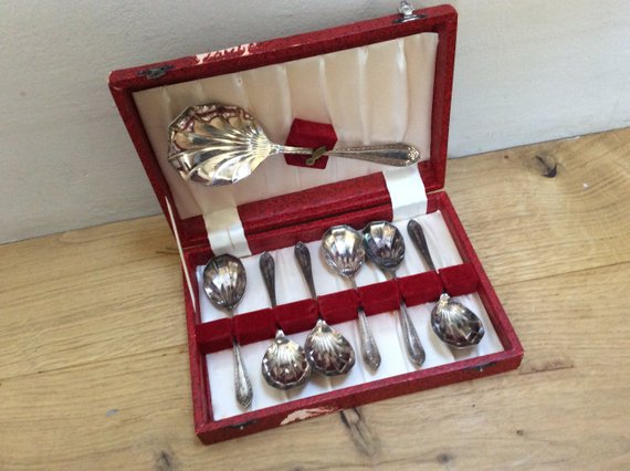 Art Deco Epns Silver Plates Cased Set of Six Fruit Spoons & Server c.1920 Red. Asked