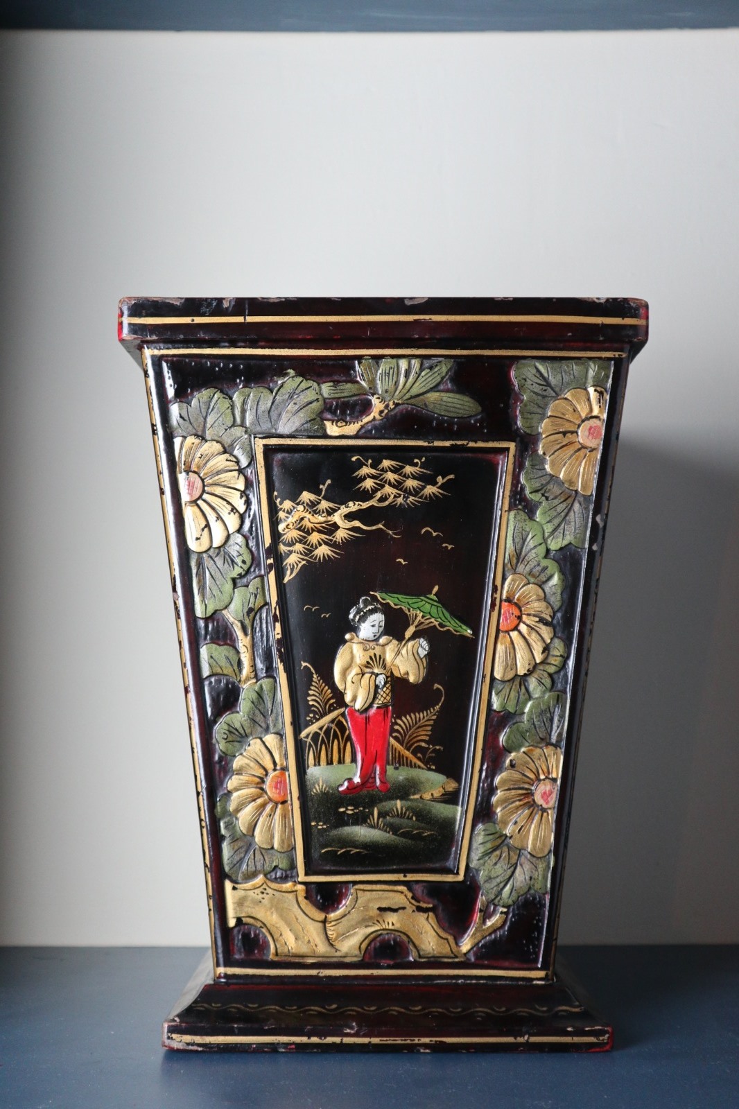 Art Deco Era 1920s Chinoiserie Jardiniere / Planter, Chrysanthemum Motif, Ebonised Carved Wood & Painted Gilt Decoration 'Chinese Ebonised'