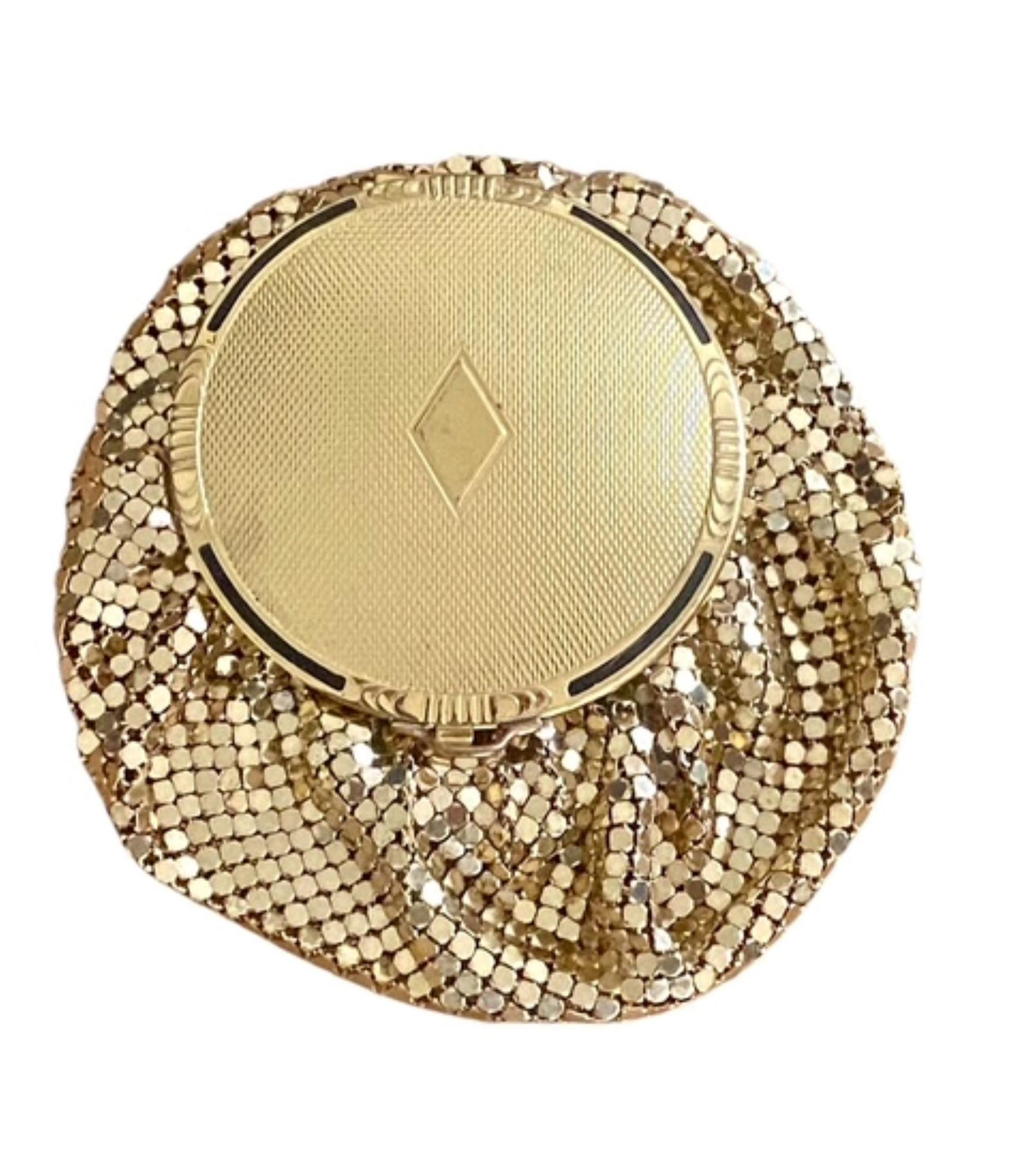 On offer is this most glamorous circa 1930 Evans gold mesh vanity purse. The case measures when flat approx. 11cm in diameter and the circular top is 6.5cm in diameter. The body of the purse is made of lined gold mesh and the lid has gold tone metal machine turned pattern with chased and black enamel border and central, diamond shaped blank cartouche. The lid opens and closes securely to access the lined purse interior. Under the lid is another hinged door which opens to a covered powder well door. This powder section contains the original clean powder puff. Above this is a double-sided hinged metallic mirror which also acts as a door to the hidden rouge compartment. This has the complete original contents of pressed pink rouge impressed with the Evans logo and also retaining a replacement puff and paper insert.